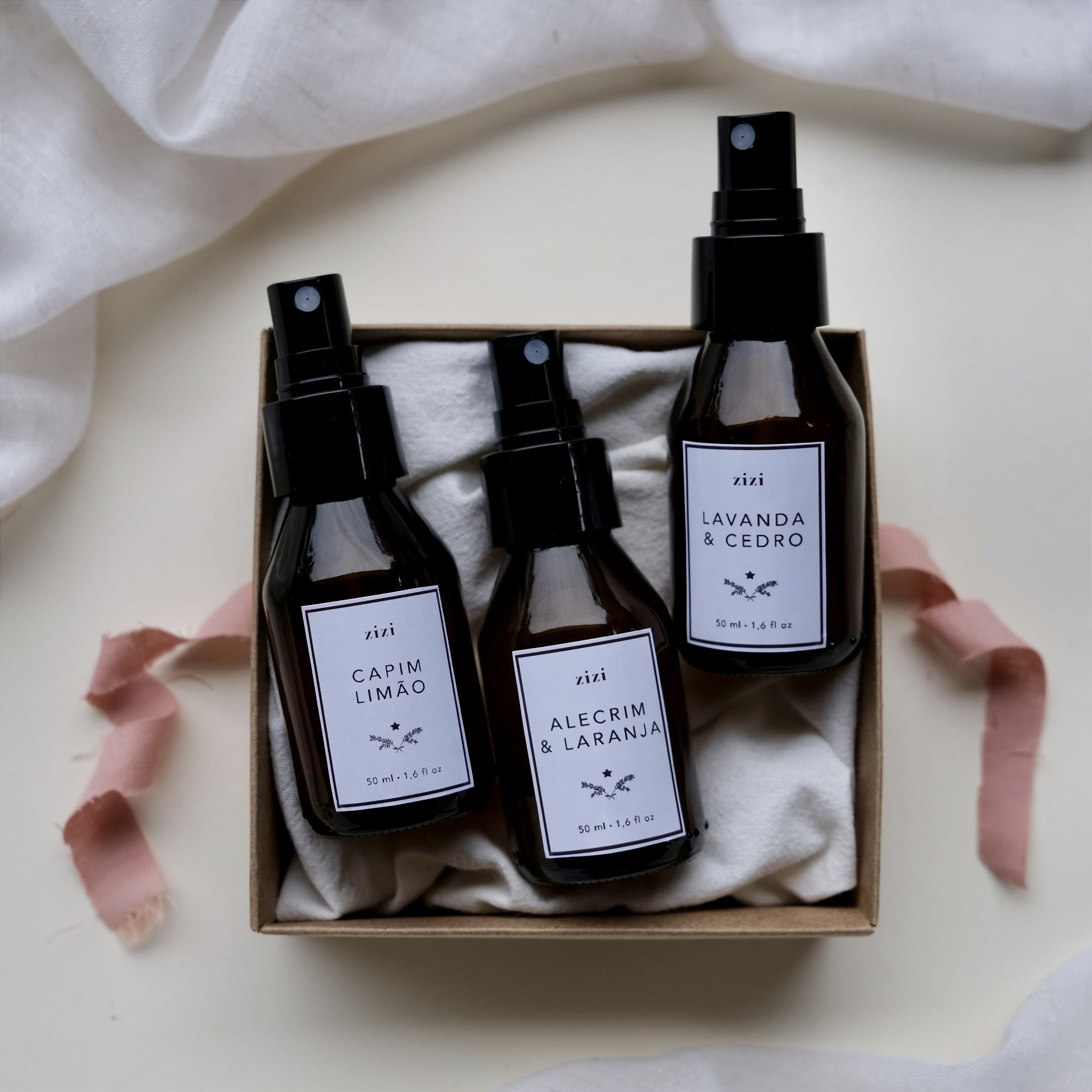Os sprays vão dentro da caixinha de presente, como mostra a foto. Acompanha também folheto explicativo de como utilizar.